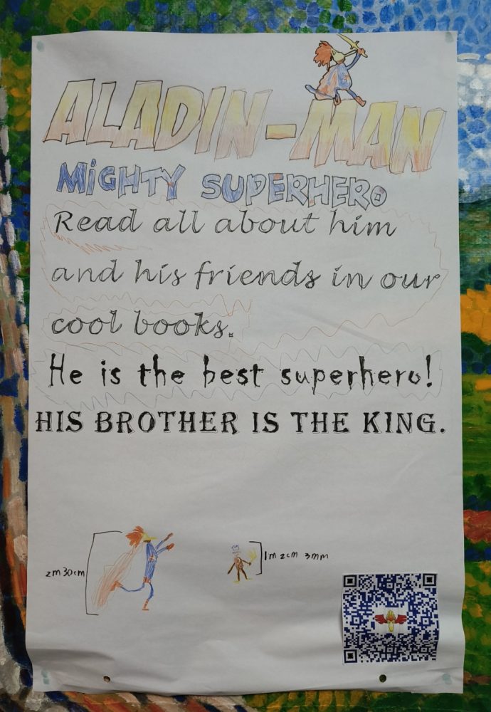 The littlest of the two little dudes who created Aladin-Man and the stories of his adventures made this poster several years ago. It’s very impressive work for a 6 year-old and the stories being advertised are quite remarkable in that they were created when the kids were preschoolers!