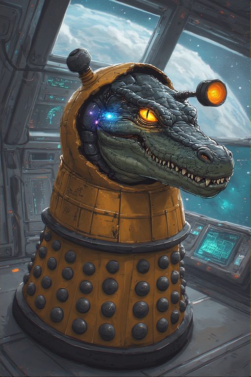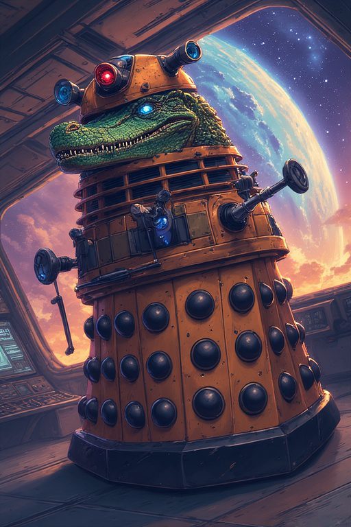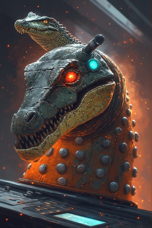 I’m thinking of a half Green Gator half Dalek cyborg with the attitude of Marvin out of Hitch Hiker’s Guide to the Galaxy.