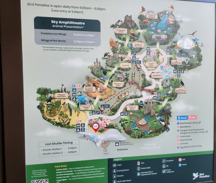 Apart from the incredible birds and habitats, the park’s facilities are excellent. Wheelchair ramps are everywhere, and volunteers are quick to assist anyone who needs help. Rest areas with air-conditioning are located between each section, which is a lifesaver in Singapore’s heat (without them, I’d have been baked like a cookie!). The food is delicious, though a bit pricey, and the restrooms are spotlessly clean, which I greatly appreciate.