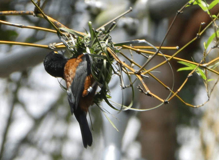 The other sections of the park are massive walk-through aviaries, each as large as half of my school. Tourists are allowed to enter these areas and explore. The largest aviary is called Heart of Africa, which is divided into three levels. The ground level replicates African wetlands and is home to birds like the purple swamphen and crowned crane. The middle level has shorter trees and is filled with colorful parrots. The top level features towering trees where starlings soar and nest. The aviary has wooden boardwalks on different levels, allowing visitors to view the birds from multiple perspectives. The birds are free to roam, fly, or hide wherever they choose, which makes exploring feel like a treasure hunt. My dad and I brought cameras and turned it into a competition to see who could spot more birds. It was so much fun! The picture below shows a chestnut-and-black weaver building its nest from grass. I had only seen this on TV, so witnessing it in person felt like a dream come true—a magnificent experience.